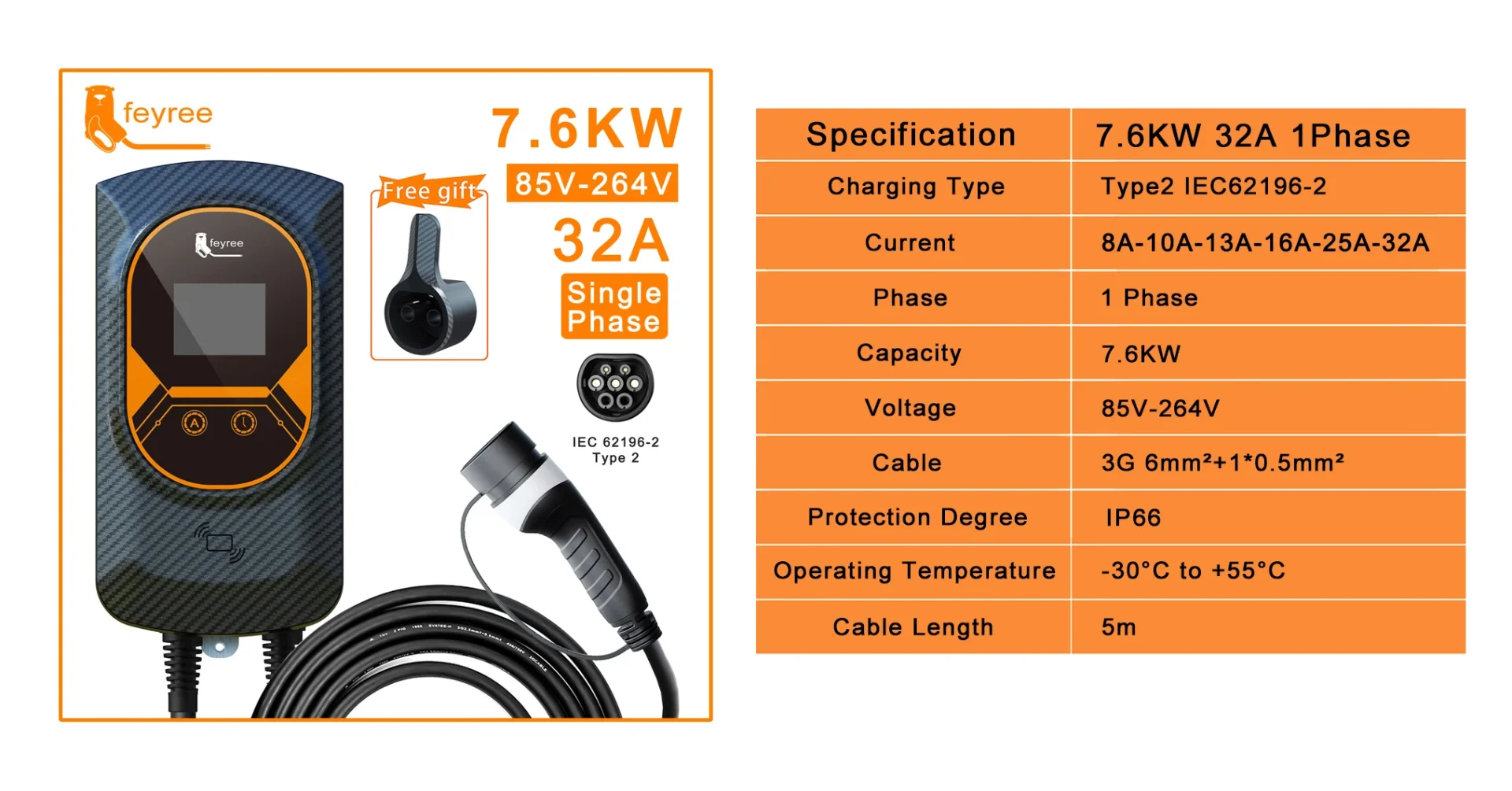 EV Charger Type2 32A EVSE Wallbox with IEC62196-2 Adapter 7.6KW Wallmount Charging Station 5m Cable for Electric Vehicle