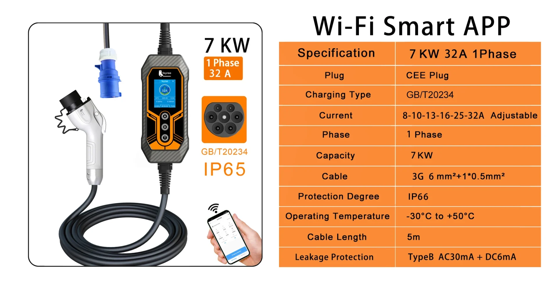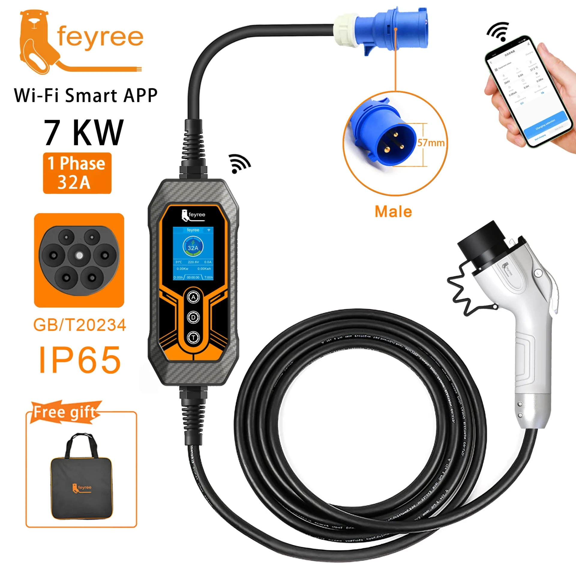 GB/T Portable EV Charger 32A 7KW 1Phase APP Bluetooth Version EVSE 11KW 16A 3Phase Cable 5m CEE Plug for Electric Vehicle