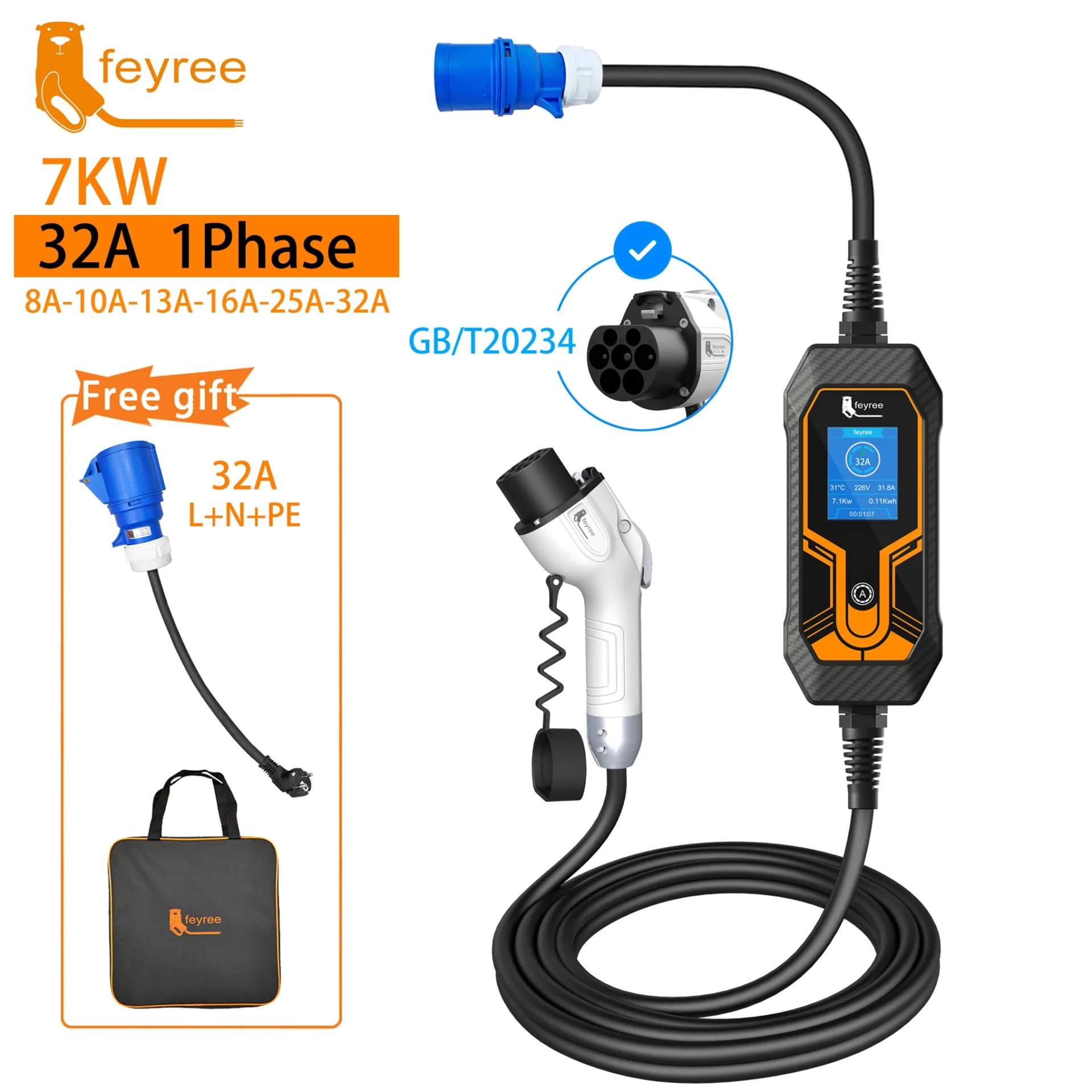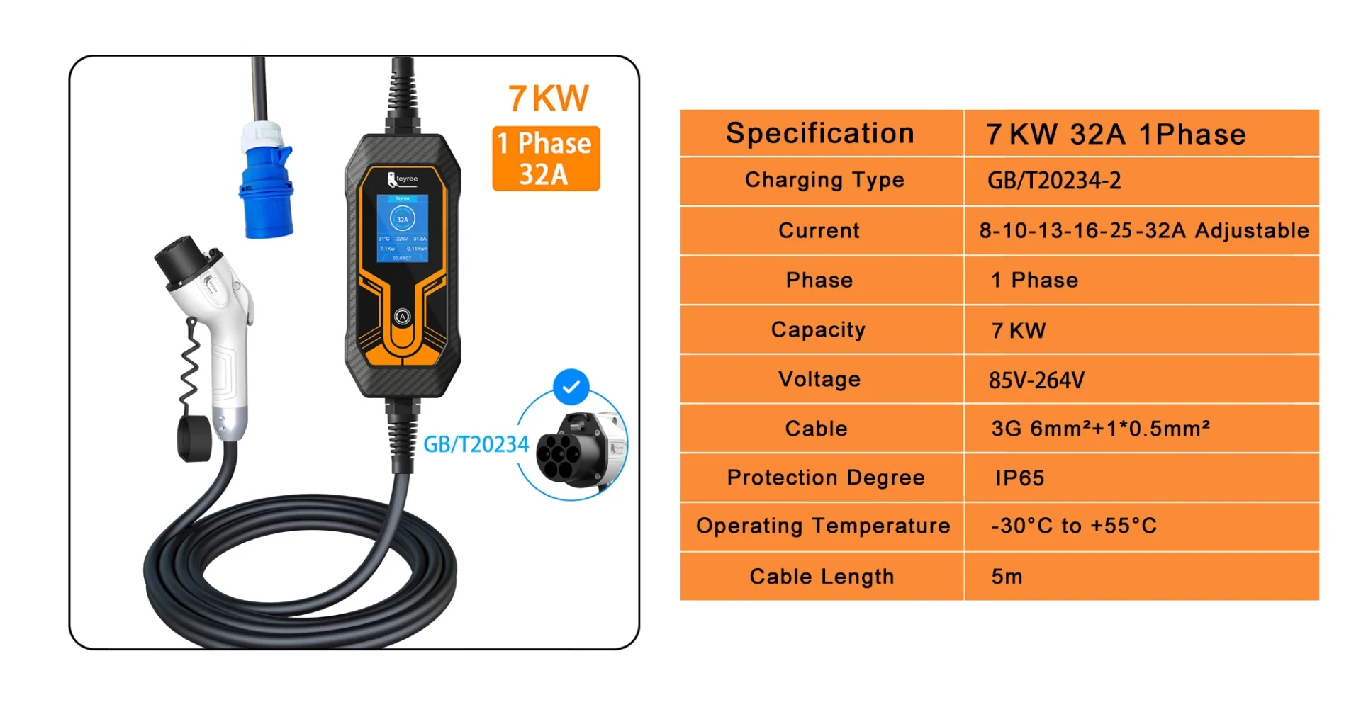 Portable EV Charger Wallbox GB/T Cord 7KW 32A 5m Cable 1Phase EVSE Charging Box Charging Station for Electric Vehicle Car