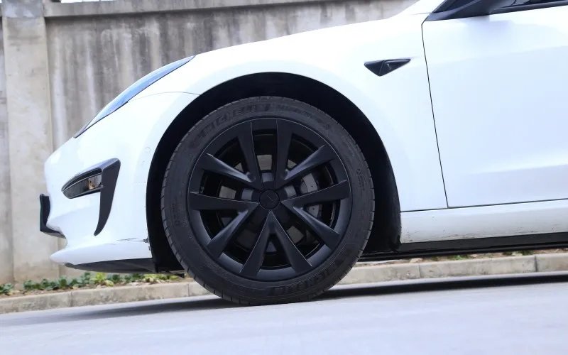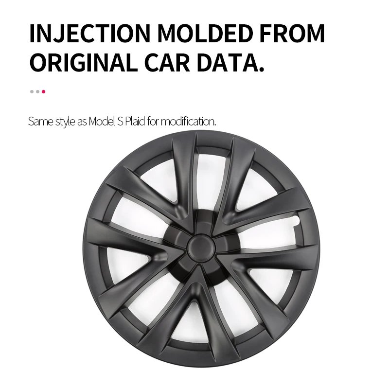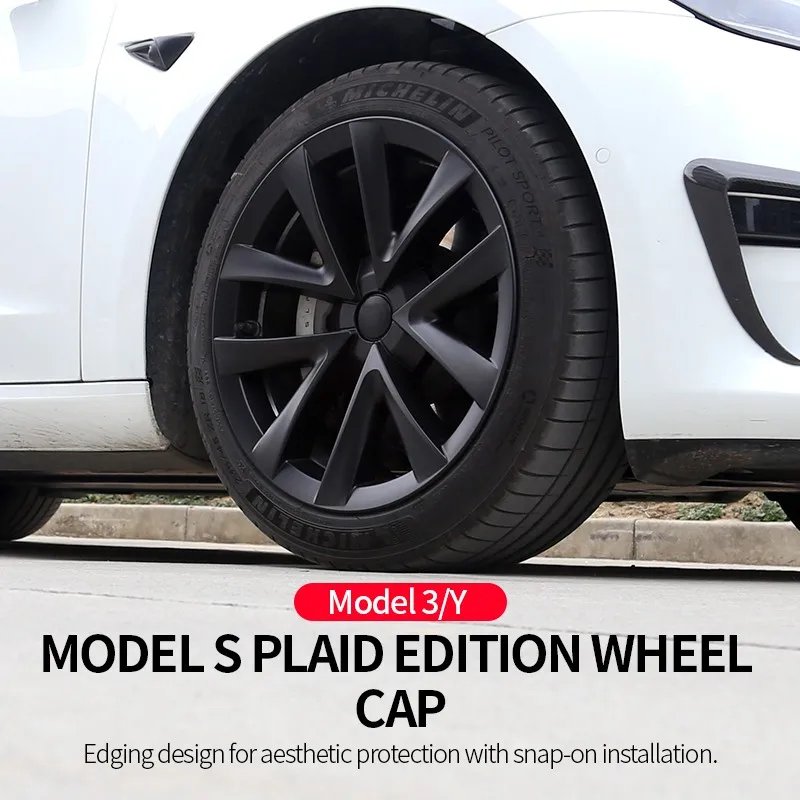 Model S Plaid with the same hubcap, fully surrounded design, so that the original car 18-inch wheels look bigger.