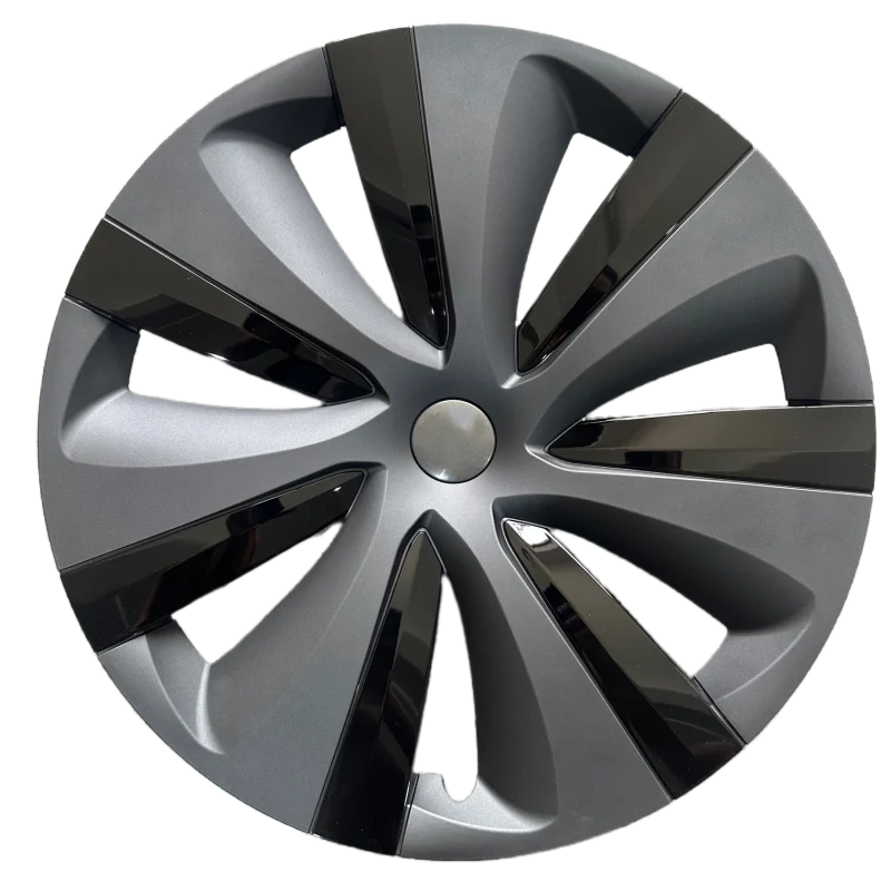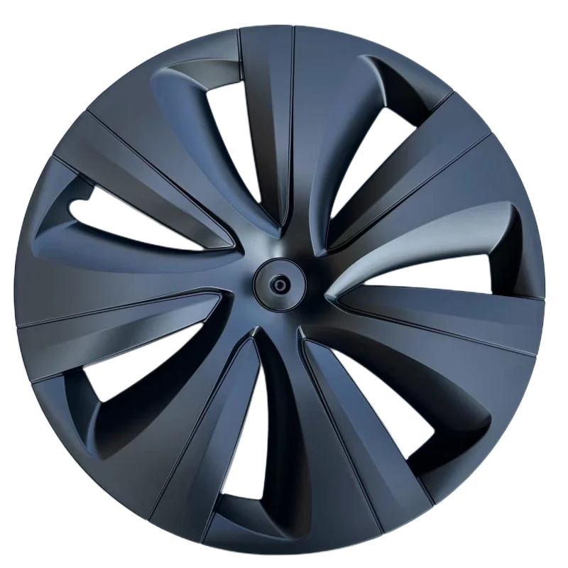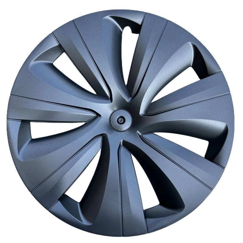 Model S Plaid with the same hubcap, fully surrounded design, so that the original car 18-inch wheels look bigger.